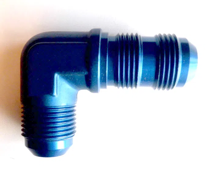 A fitting that forms an angle of less than 180 degrees (3.141 radians) from a straight flow. Both connecting ends have machine threads (straight threads other than pipe or hose series) designed to accommodate a tube or is unthreaded and designed to accommodate a tube. It may have side or heel inlet(s).